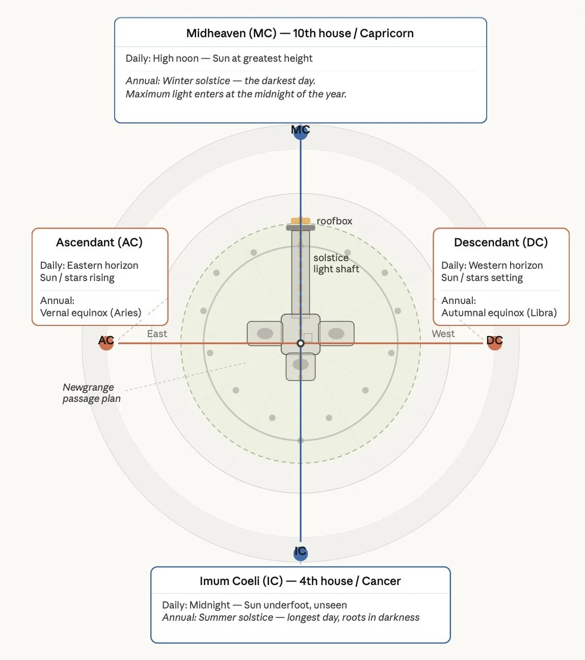 In other words, your birth chart is a circular womb-tomb whose angles are cruciform chambers oriented to solstices and equinoxes, oriented to the relationship between earthen body and light of sun.